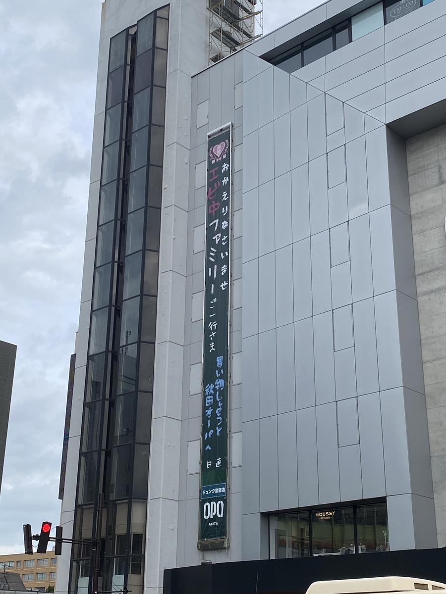 これは秋田駅前にあるショッピングモール、秋田オーパにかけられていた垂れ幕。エビ中の楽曲『買い物しようと町田へ』をモチーフにした文章が書かれている。